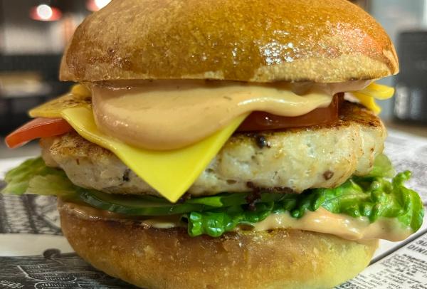 Булочка, котлета куриная, огурцы, помидоры, романо, соус, чеддер, картофель фри