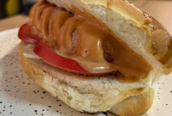 Булочка, колбаска фирменная, помидоры, огурцы марин., чеддр, соус грибной
