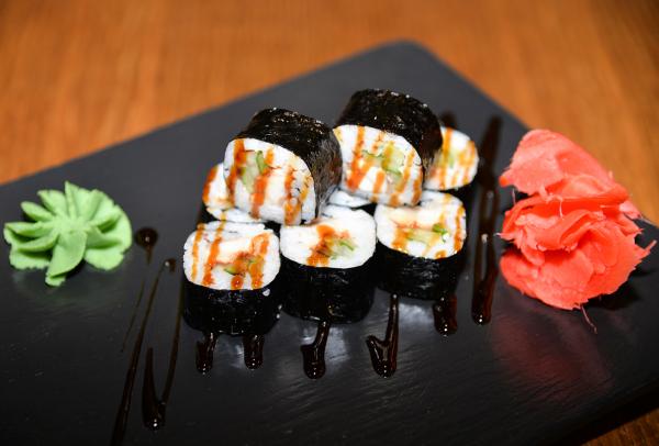 рис, нори, грудка копченая, сыр творожный, лук зеленый, масаго, соус