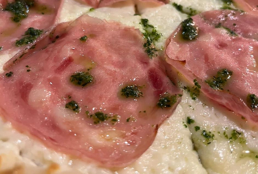 тесто, соус белый, соус томатный, ветчина, сервелат, лук репч.,грибы, помидоры, оливки, зелень, сыр, масло чесночное