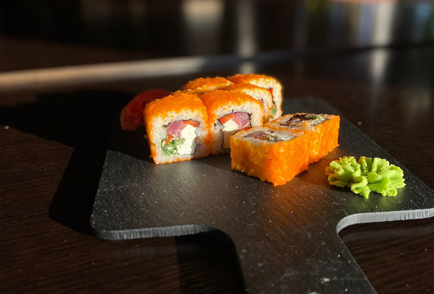 Рис, нори, лосось слабой соли, сыр творожный,огурец